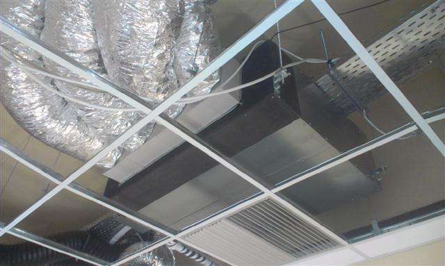 Παραθέτουμε δείγμα φωτογραφιών από εφαρμογή δικτύου κλιματισμού εξαερισμού σε εστιατόριο στην παλιά πόλη. Χρησιμοποιήθηκαν εύκαμπτοι μονωμένοι οδευτές με κουτιά στομίων για τον κλιματισμό και στρογγυλής διατομής αγωγοί για την χοάνη απαγωγής καυσαερίων.
